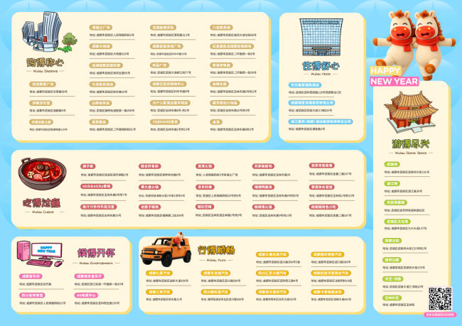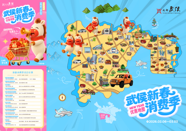 为了让市民游客在新春佳节期间更便捷地玩转武侯,启动仪式上将重磅发布“武侯新春消费优惠地图”。该地图深度整合全区商旅文体资源,精心梳理并串联了“购得称心、住得舒心、吃得过瘾、娱得开怀、行得顺畅、游得尽兴”六大板块内容。市民游客“一图在手”,即可精准获取全域促销资讯与游玩攻略,轻松实现“吃住行游购娱”一站式满足,尽享武侯新春的多元魅力。