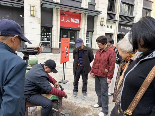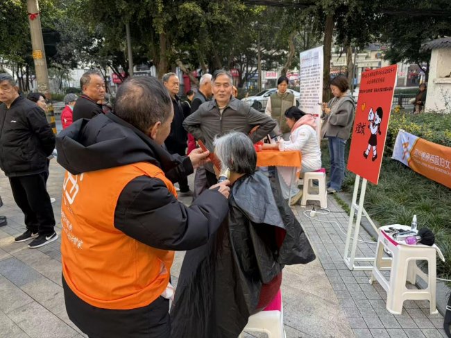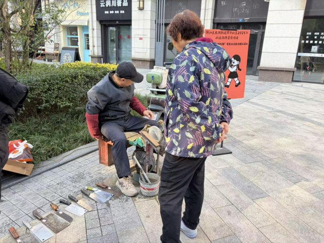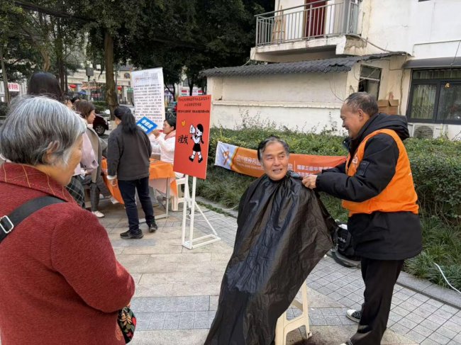 在便民服务区,理发服务受到老年居民的热烈欢迎,理发师耐心细致地为社区60岁以上老年人修剪发型,大家脸上洋溢着满意的笑容。磨刀服务同样人气高涨,居民们将家中刀具妥善包装后带来现场,师傅熟练地打磨,让一把把刀具重焕锋利。